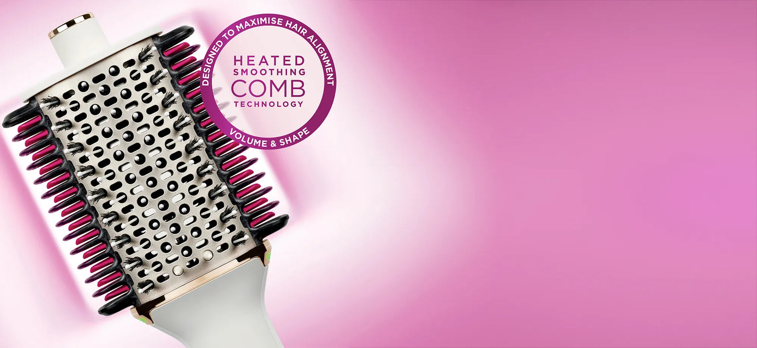 The heated smoothing combs are the pink ceramic-coated plates that are found on either side of the unit. These combs turn on and heat up when in Dry Hair Mode to help create smooth, voluminous,and soft hair with shape and bounce